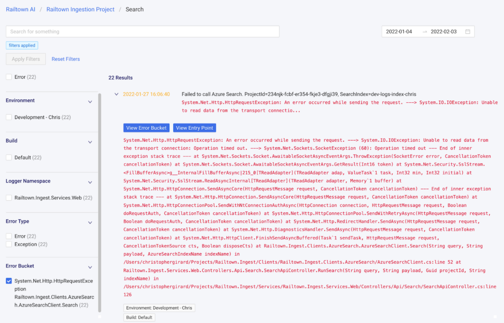 Sometimes developers need to investigate errors sequentially and see what events occurred immediately before and after a specific error. Along with building a way to view your errors in sequential order, we have added a powerful search tool utilizing Azure cognitive search service. Each error is indexed by Azure as it’s detected so it’s immediately searchable and filterable, using a range of intelligent facets. This makes searching in real time possible. It also allows developers to search for errors in specific environments, builds, or by error type, and error buckets.