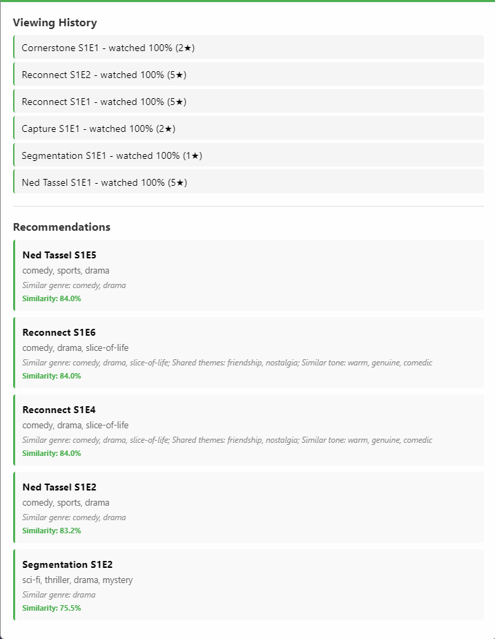 These considerations are all taken into account when calculating the score. This allows the app to display the user’s watch history and some recommendations based on other user’s ratings/genre match
