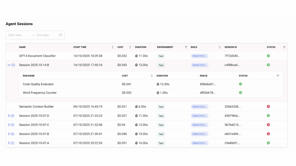 Track every execution with detailed metrics: start time, cost, environment, build, and more.