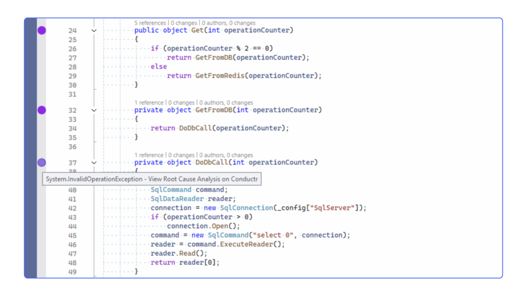Conductr’s Root Cause Agent inspects the stack trace and understands the root cause of an error and its impact. Errors are analyzed according to their root cause with insights of the areas of application impacted. Eliminate duplicate error investigations and fix issues at their core faster.